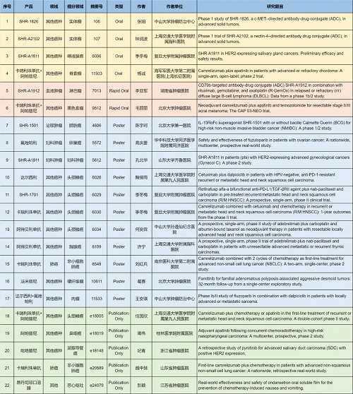 在肺癌、妇科肿瘤、淋巴瘤、膀胱癌、头颈肿瘤、黑色素瘤、肉瘤、鼻咽癌、脊索瘤、唾液腺癌、胸腺癌、硬纤维瘤、涎腺导管癌等其他多个疾病领域,卡瑞利珠单抗、阿帕替尼、阿得贝利单抗、吡咯替尼、达尔西利、氟唑帕利、法米替尼、SHR-1501、瑞拉芙普-α(SHR-1701)、SHR-1826、瑞康曲妥珠单抗(SHR-A1811)、SHR-A1912、SHR-A2102等抗肿瘤创新药相关研究一共入选了4项口头报告、2项快速口头报告、11项壁报展示和4项线上发表,彰显了Z6尊龙医药强劲的研发实力。此外,昂丹司琼口溶膜在防治化疗导致的恶心呕吐方面展现出了良好的疗效,本次ASCO年会有1项研究线上发表。